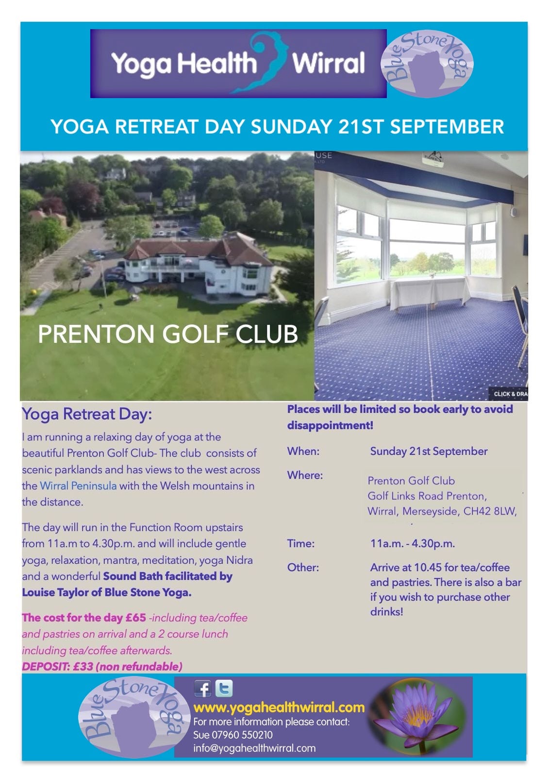 In addition to the weekly classes, I am running a wellbeing retreat day on Sunday, 21st September at Prenton Golf Club: