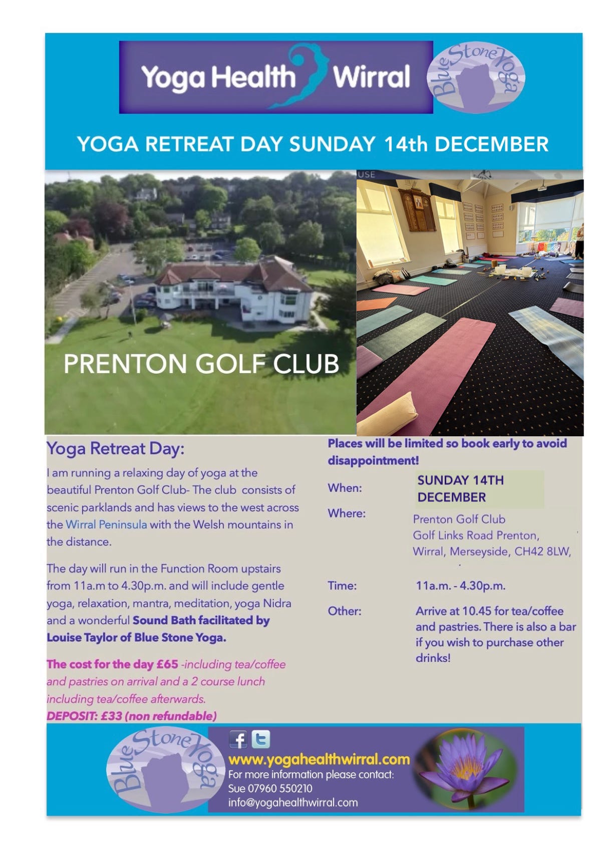 Following on from the restorative yoga day in September, I will be running another day as a pre-Christmas stress release on Sunday, 14th December at the same place and time in Prenton Golf Club. Louise Taylor of Bluestone Yoga will join me again to facilitate the Sound Bath.